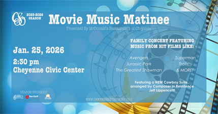 The whole family will love this concert featuring music from hit films like Avengers, Jurassic Park, The Greatest Showman, Superman, and Trolls plus a new Cowboy Suite arranged by Composer in Residence, Jeff Lippencott. Come in costume and explore our instrument petting zoo starting at 1:30pm in the lobby. Presented by McDonald’s Restaurants of Cheyenne.
